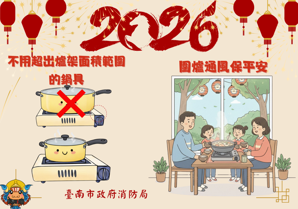 市長黃偉哲特別叮嚀:「臺南人圍爐火鍋最澎湃,大家在室內吃火鍋時,一定要記得打開窗戶,保持空氣流通」;馬年要過得龍馬精神,安全防護第一步就是不能因為怕冷就將門窗緊閉,空氣流通是防範危險第一道防線;同時呼籲市民在烹煮年菜時,務必養成「人離火熄」習慣。