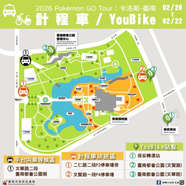 交通局說明,活動三日除原有的公車路線(高鐵快捷公車H31、紅3、紅4、5路(往大甲里))可抵達會場,本府觀光旅遊局將提供二條分別自高鐵臺南站及家樂福新仁店往返臺南都會公園活動主會場的免費接駁公車,讓搭高鐵來的外地遊客及開車民眾便利停車轉乘。此外,鼓勵大家多利用臺鐵班次前往保安站下車,免去開車找車位的困擾,不論自高鐵臺南站搭乘沙崙線,或南下或北上區間列車,均可選擇於臺鐵保安站下車後步行約10分鐘前往臺南都會公園(奇美博物館),臺鐵公司也提醒搭車民眾保安站的站體空間有限,請提前購票或利用電子票證進、出站,以加快通行速度。相關資訊可至本府網頁及《Pokémon GO》活動官網查詢https://pokemongo.com/zh_Hant/gotour/tainan、台南旅遊網 https://www.twtainan.net/zh-tw/、台南旅遊臉書粉絲團 https://www.facebook.com/traveltainan。