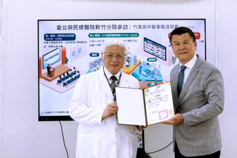 ▲北榮新竹分院協助竹東高中高三學生於學測放榜前進行職涯探索,護理長帶領學生參訪智慧病房,實地體驗數位化對護理工作、照護流程及病人照護品質的影響。竹東高中詹文克校長(右)致贈感謝狀予北榮新竹分院陳曾基院長,感謝北榮新竹分院協助醫事職涯探索與在地人才培育。(圖/北榮新竹分院提供)