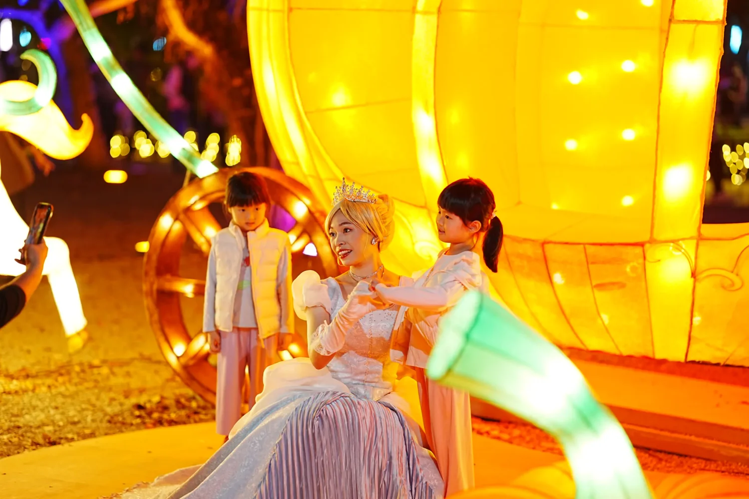 教育局表示,走進「童趣歡樂谷」燈區,彷彿踏入一座會發光的童話世界,金黃燈光宛如星河鋪展,搭配林間光影與繽紛燈飾,在散步賞燈時,也能享受一段專屬於家人的夜間小旅行;許多家長推著娃娃車、牽著孩子慢慢走,沿途拍照打卡、留下合影,也有許多祖孫三代同框拍照,留下「一起長大」的珍貴畫面,成為燈會最暖心的風景。
