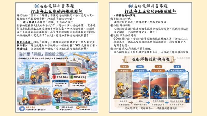 【焦點時報/記者蔡宗憲報導】台船公司3月9日推出造船科普圖卡,聚焦電銲,介紹焊接流程與安全要點,帶民眾認識工藝,支持台灣造船產業。