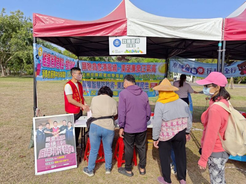 活動當日,政風室於千禧公園設置政令宣導攤位,向民眾宣導「公務員廉政倫理規範」、「公益揭弊者保護法」、「公職人員利益衝突迴避法」、「反賄選」、「反詐騙」及「廉政透明晶質獎」等重要議題。透過日常生活案例說明及有獎徵答互動方式,讓民眾以輕鬆易懂的方式認識廉政理念,深化廉潔意識,並將誠信價值帶入家庭與社區,逐步形塑清廉社會風氣,進一步強化民眾對政府推動廉政建設的支持。