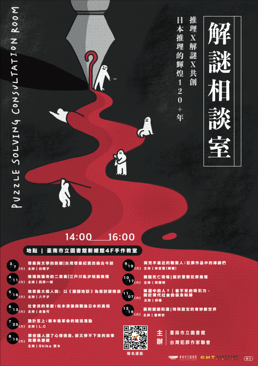 南市圖去年首度辦理推理主題讀書會, 10場活動皆迅速額滿,讀者回響熱烈。今年「解謎相談室」以日本推理發展120+年為主軸,規劃10場主題讀書會,系統梳理日本推理文學的重要流派與關鍵轉折。內容涵蓋江戶川亂步奠基本格推理的獵奇美學、夢野久作代表的變格派精神實驗、松本清張引發的社會派革新、以及新本格強調詭計與邏輯對決的創作浪潮,同時亦延伸至警察推理、法庭推理、致鬱系懸疑、都市傳說題材與近年興起的特殊設定推理等面向,完整呈現推理小說如何回應不同時代,映照社會現實與人性幽微。