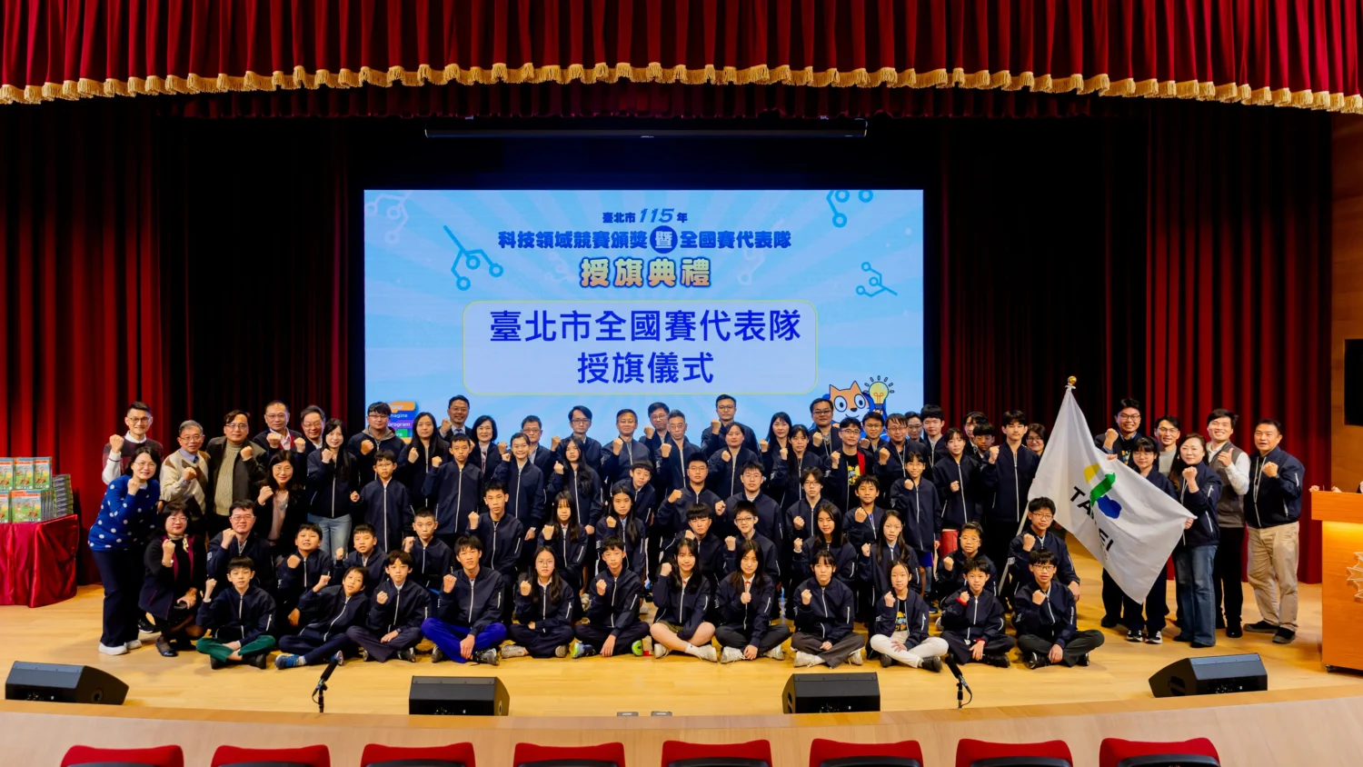 臺北市政府教育局於115年3月12日(星期四)上午10時,於臺北市大同區日新國民小學旺台廳,舉行「115年科技領域競賽頒獎暨全國賽代表隊授旗典禮」。本次活動邀集「Scratch 貓咪盃創意競賽」特優隊伍、「生活科技競賽」前三名及「資訊科技競賽選訓」優秀選手共同參與,旨在透過聯合頒獎肯定本市師生於科技領域的實作成果,並由鄧副局長親自授旗,激勵即將代表臺北市進軍全國賽的頂尖選手,展現本市對科技素養教育的高度重視! [圖:臺北市政府教育局]