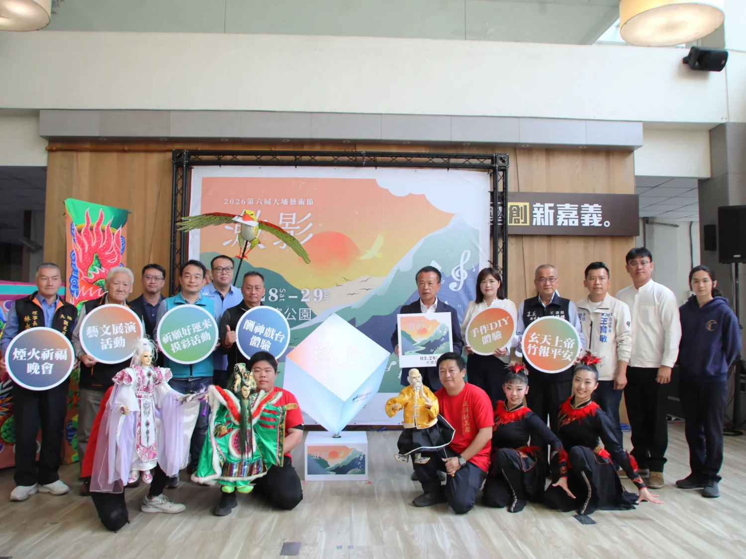 2026大埔藝術節「瀲影」將於3月28日(週六)至3月29日(週日)在嘉義縣大埔鄉湖濱公園熱烈登場,活動將結合當地的信仰——「玄天上帝」,呈現宗教與藝術的完美融合。為了邀請全國各地的朋友們共襄盛舉,嘉義縣政府今(17)日在縣府招商空間舉行宣傳記者會,為即將到來的藝術盛會預熱。