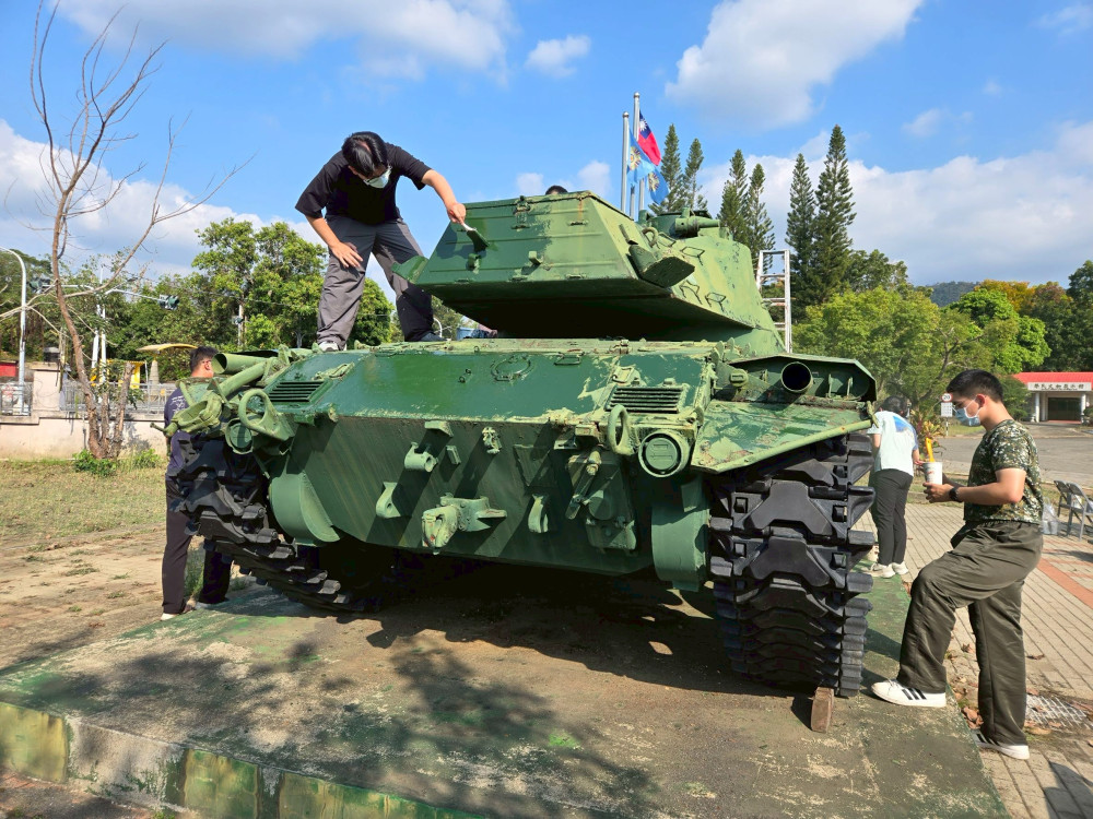 在整理過程中,官兵們不畏辛勞,特別針對家區內極具歷史意義退役軍事裝備進行深度維護;他們爬上斑駁除役戰車仔細除鏽、重新漆上飽滿軍綠色,並為海軍船錨展示品換上亮麗防鏽漆;這些裝備在官兵巧手下重現昔日雄風,大幅提升園區景觀美感,也讓居住在榮家退役前輩們倍感親切與懷念。