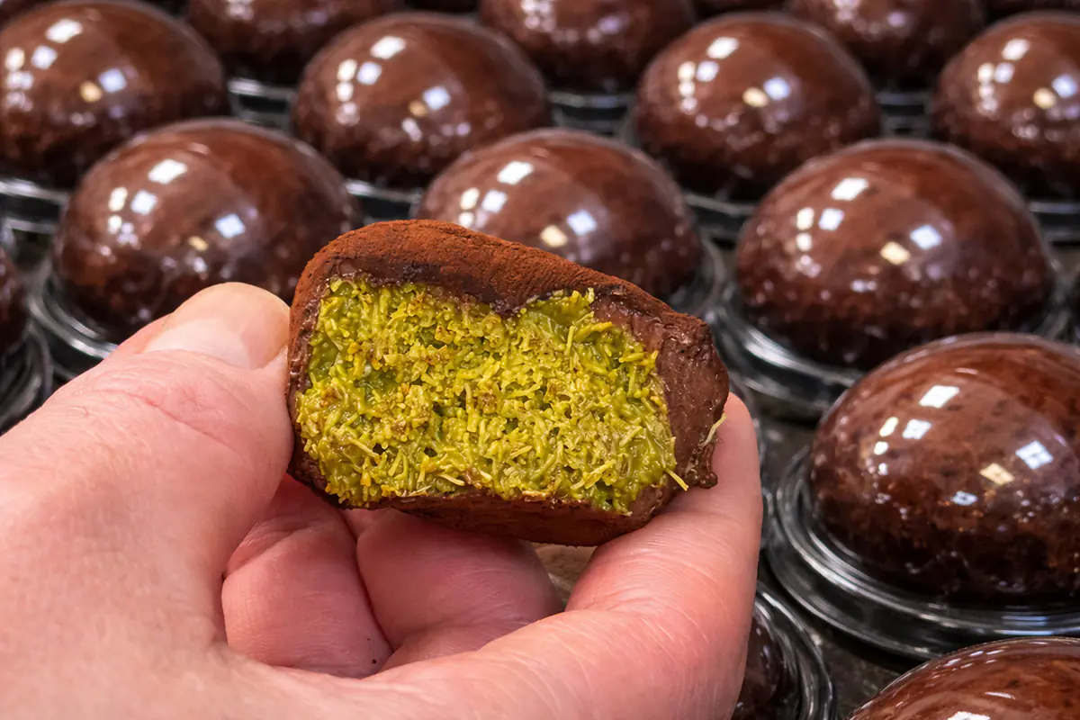 ▲台南遠東香格里拉品香坊「經典杜拜巧克力」,以濃郁巧克力結合開心果內餡與卡達伊夫(Kataifi)酥絲,打造外脆內層豐富的口感;還有隱藏版蜂蜜口味可接受預訂。(圖/台南香格里拉提供)