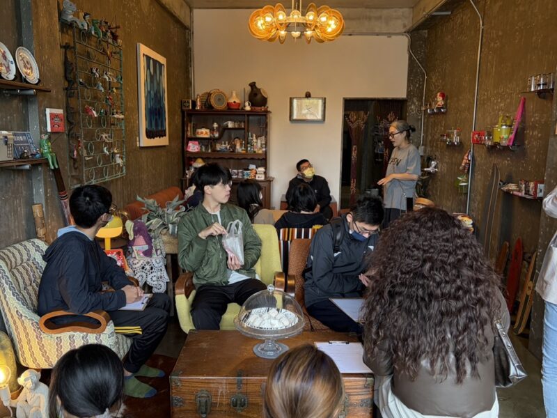 踏查行程由梅琴洋行楊珮琪總監親自帶領,依序走訪梅琴洋行、象鼻堂、丈引小院等文化品牌據點,從空間氛圍、物件陳設、經營理念到文化轉譯方式,深入感受眷村文化在當代再生的多元樣貌,透過細緻導覽與文化敘事,引領學生走入建業新村的歷史紋理與生活記憶,也在現場討論中思考如何將地方文化轉化為可被感知、可被參與的設計語言。
