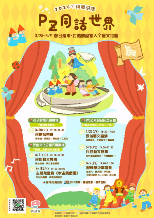 「2026平鎮藝術季」將在3月28日至5月9日期間,分別在社子埤塘生態公園、民俗文化公園與1895乙未保台紀念公園,共辦理6場次藝文展演活動,今(2026)年以「PZ同話世界」為主題,邀請市民透過音樂、歌舞、兒童劇與民俗技藝,重新發現生活場域中的美好。