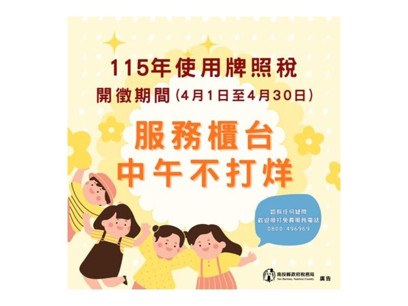 稅務局指出,4月整月實施中午服務不打烊,提供納稅人補發稅單、申辦身心障礙者免稅等多項服務項目,歡迎民眾多加利用,如對使用牌照稅繳納有任何疑義或不明瞭,歡迎撥打稅務局免費服務電話:0800-496969洽詢。