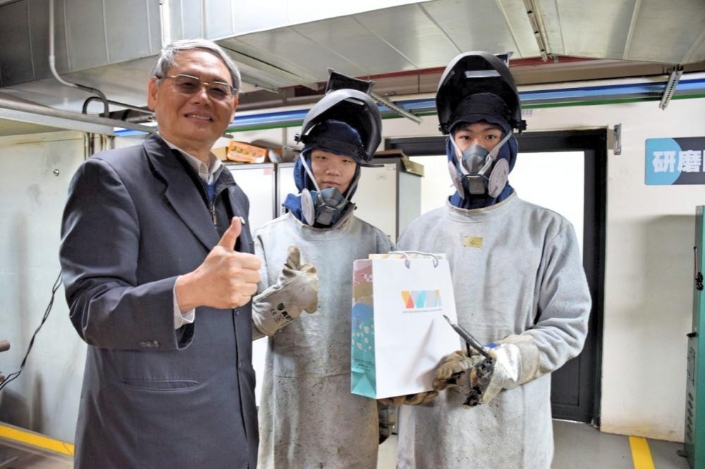 ▲桃竹苗分署銲接培訓選手趙ㄐㄧㄥ(3聲)錙(中)不負眾望,勇奪第56屆全國技能賽北區賽金牌,另一位選手吳念承(右)則榮獲第四名。圖左係桃竹苗分署長賴家仁於賽前為選手加油打氣。(圖/桃竹苗分署提供)