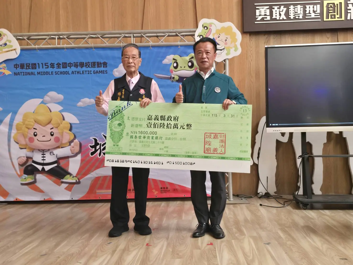 嘉邑城隍廟董事長楊嘉南表示,城隍爺守護地方、庇佑百姓,此次捐贈不僅是對體育發展的支持,更是為所有參賽選手祈福加持,期盼選手們在競技場上全力以赴、再創記錄,為嘉義縣爭取最高榮耀。