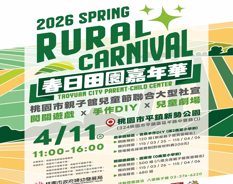 婦幼發展局表示,兒童月的活動重頭戲「2026 SPRING RURAL CARNIVAL 春日田園嘉年華」將於115年4月11日11時至15時在平鎮新勢公園登場,活動結合精彩舞台表演、趣味親子闖關遊戲及寓教於樂的食農體驗DIY,讓孩子在遊戲中學習、在體驗中成長。透過多元參與,不僅促進親子互動與情感連結,也引導孩子從小認識食物來源,培養珍惜土地與尊重食物的良好觀念,打造兼具教育與樂趣的春日親子盛會。