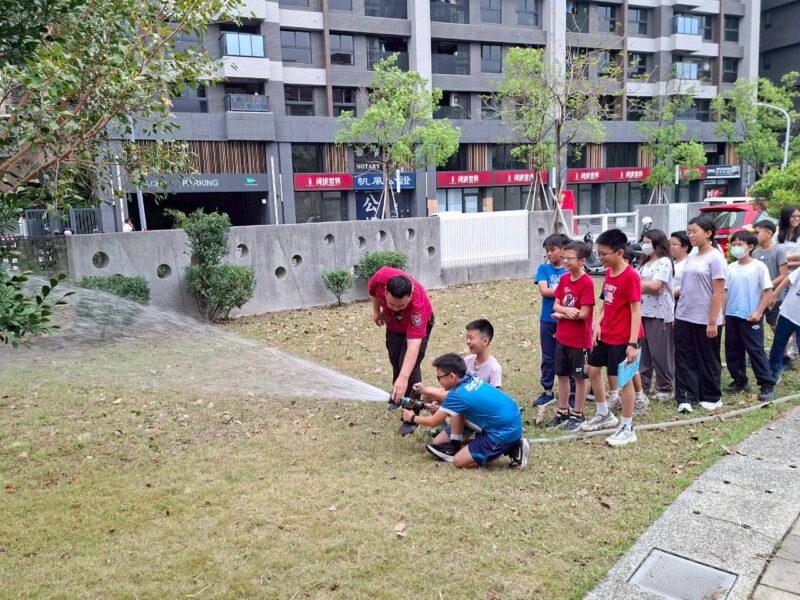 活動亮點則在於動態實作體驗。消防隊員示範「身上著火停趴滾」三步驟,建立學童正確的滅火本能。現場更展示了消防車與救災器材,讓學生近距離接觸第一線專業裝備,提升對救災工作的認知。