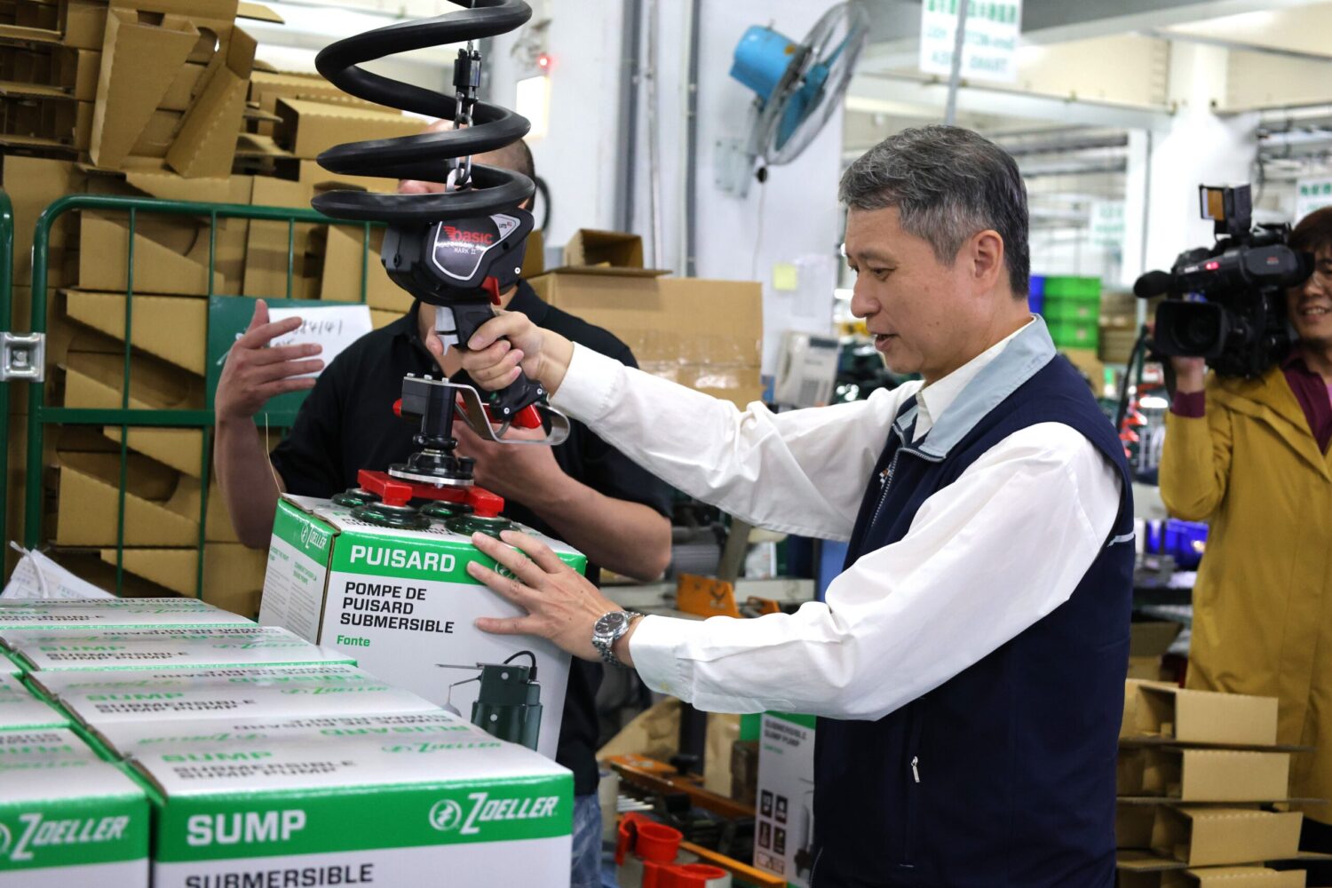 在產品包裝區,陳瑞嘉體驗真空吸盤搬運設備,將重達16公斤的產品輕鬆移動至棧板上,幾乎不需費力。生產技術副理鄧文華笑說,一開始大家還半信半疑:「直接用手搬不是更快嗎?」但熟悉設備後才發現,不僅作業效率大幅提升,更有效減輕身體負擔,降低職業傷害風險。公司同時也提供護目鏡、安全鞋與護腕等完整防護裝備,從細節全面守護員工安全。