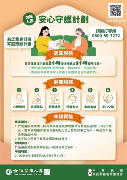 「真美豐華」保險專案不僅提供壽險保障,更結合資產增值與特定傷病保障,針對高齡社會可能遇到的嚴重阿茲海默症、嚴重巴金森氏症、嚴重頭部創傷與深度昏迷等風險,皆納入特定傷病保障,還提供「安心守護計劃」加值服務,包括免費到府的居家服務及線上顧問服務,讓家庭在面對長期照顧挑戰時有更堅實的後盾,協助保戶面對長照挑戰。 https://my.tcb-life.com.tw/family-care