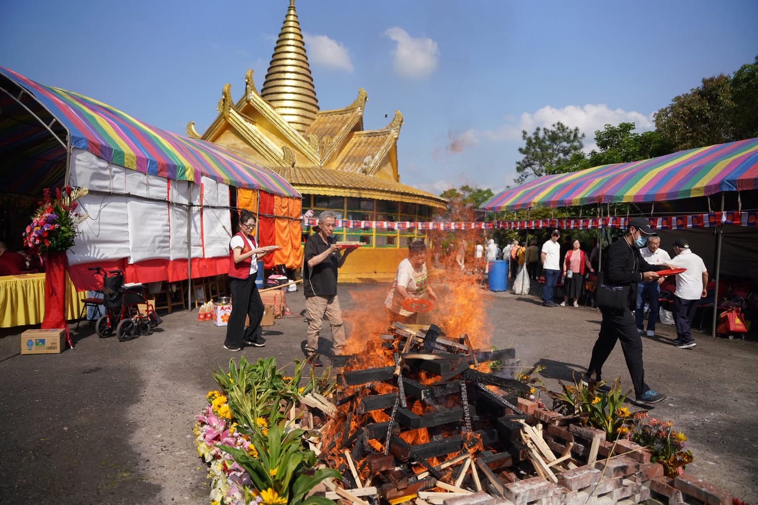 特別是在火供進行之際,烈焰與金色佛塔相映,色彩鮮明而莊嚴,構成極具震撼力的畫面。對許多參與者而言,這不僅是一場法會,也是一場難得的心靈洗禮。火焰燒的是供品,照見的卻是人心;升起的是煙雲,留下的卻是願力與希望。