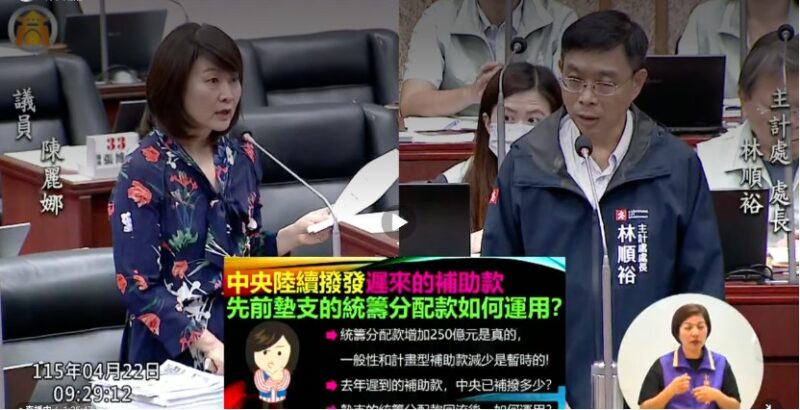 針對中央補助款金額變動,陳麗娜指出,一般性補助與計畫型補助在預算審議過程中出現科目調整與核定時程差異,導致議會難以掌握最終實際可運用財源。外界曾認為高雄補助減少174億元,但目前審查發現部分補助並非真正刪減,而是轉列一般性補助,或因尚未取得中央核定函而延後確認,使整體金額仍在變動中。她要求主計處提出完整清單,釐清258億元統籌分配稅是否被迫用來填補中央補助落差。主計處回應表示,補助款由中央各部會陸續核定,金額持續滾動調整,截至4月17日初步統計。