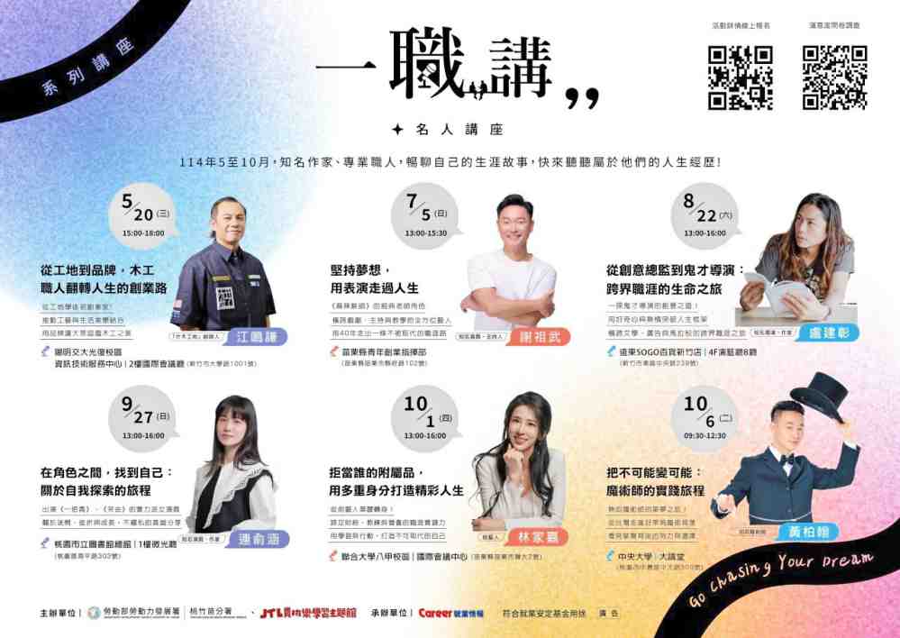 為協助青年探索多元職業、釐清未來發展方向,勞動部勞動力發展署桃竹苗分署賈桃樂學習主題館推動「一職講」系列職涯講座,預計將於5月至10月辦理6場次講座,邀請來自不同領域的專業職人與知名人士,分享其職涯歷程與人生選擇,引導青年認識多元職業,並藉由了解講者成功背後的努力與轉折歷程,啟發職涯靈感與自我探索動力。