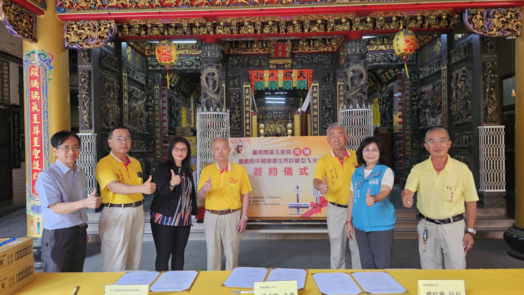 為提升偏鄉醫療可近性,嘉縣衛生局與健保署南區業務組攜手,向臺南開基玉皇宮勸募1台價值200萬元「高頻式診斷型X光機(DK Accuray 525R)」捐贈中埔鄉衛生所,今29日下午在健保署韓佩軒組長見證下,衛生局長趙紋華、玉皇宮主委涂大松共同簽署備忘錄,見證這一刻。